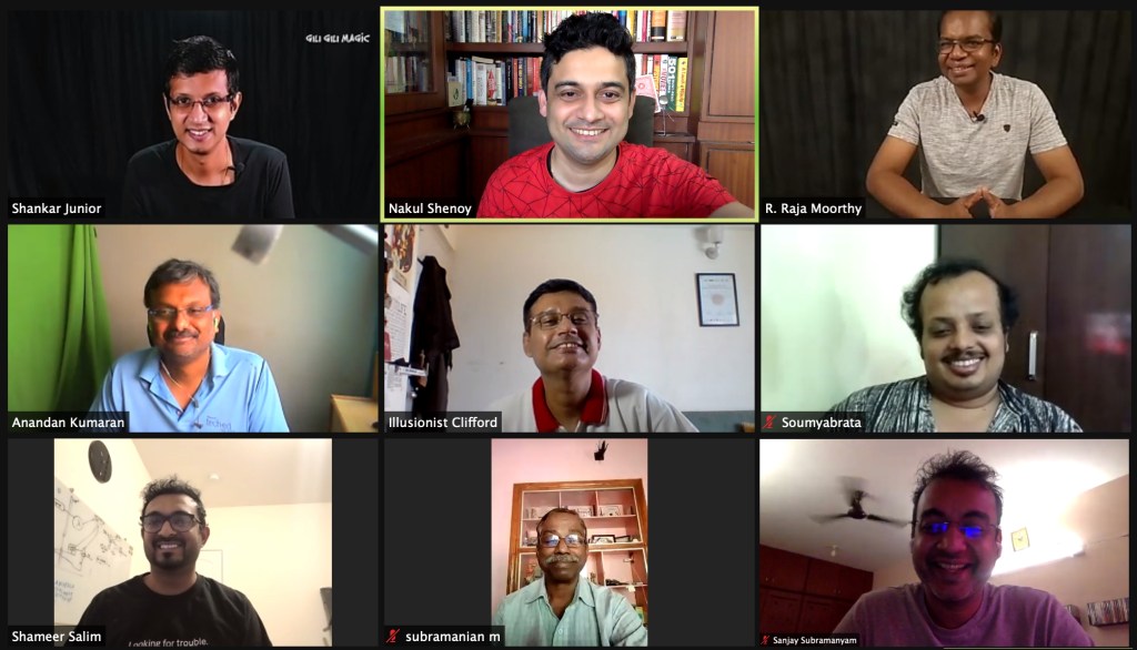 Rajamoorthy who joined us from Trivandrum performed a fascinating version of the polygraph test with cards. He had a card freely selected by a volunteer, and then mixed back in. He then asked him a few questions where the volunteer was could lie or be truthful. Despite all that, Rajamoorthy amazed everybody by accurately divining the said card.