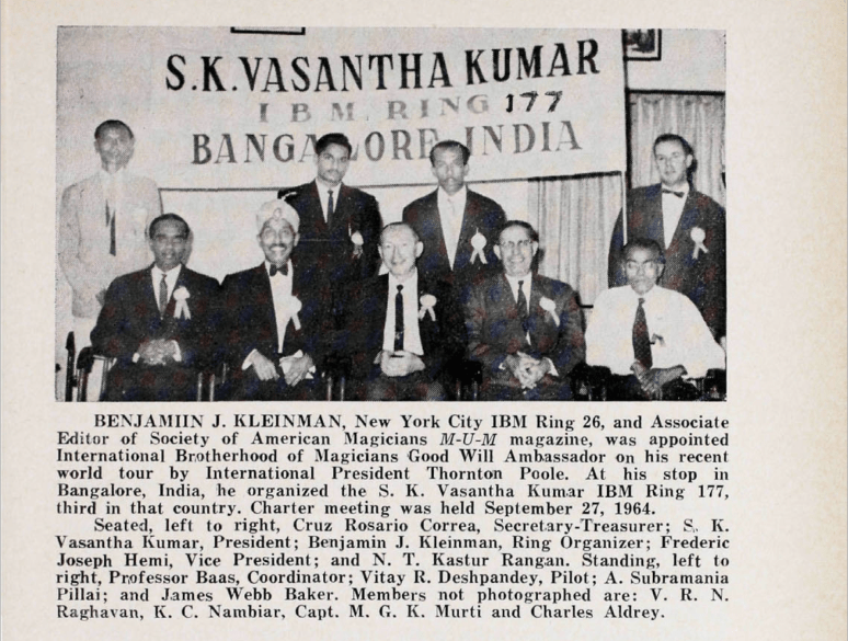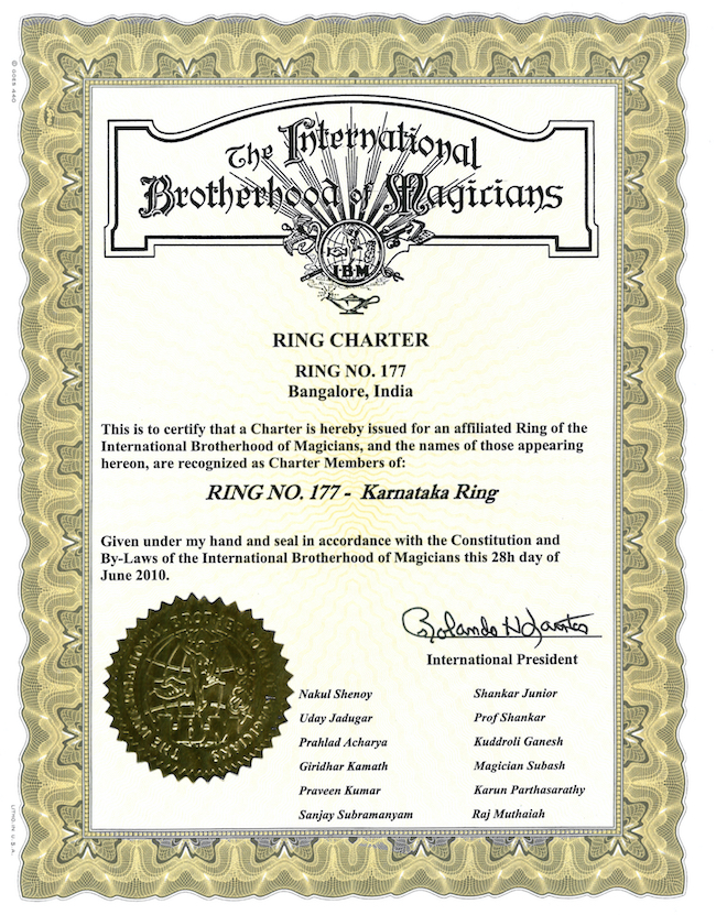 The charter for Ring 177 was presented to S K Vasantha Kumar – Ring No. 177 in Bangalore, India by the International Brotherhood of Magicians (USA) on the 15th of May, 1965
