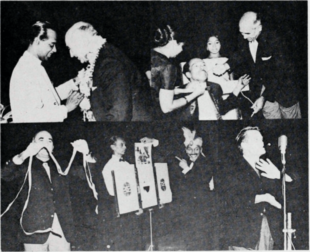 On the evening of the 5th, after a sumptuous dinner, a trick session was offered by members of both Ring 177 and the Mysore Membership. Performers included Ring Pres. Sri C. R. Corera, Prof. Pillai, Prof. Kumar, Prof. Baas, Sri Swaminathan and Dr. Panduranga Rao.